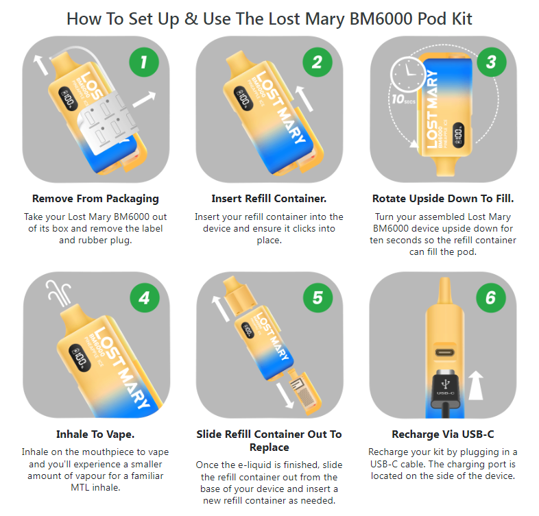 The information you provided was simple and easy to understand. It was our first time using The Lost Mary BM6000 prefilled pod kit, and we found it very easy.